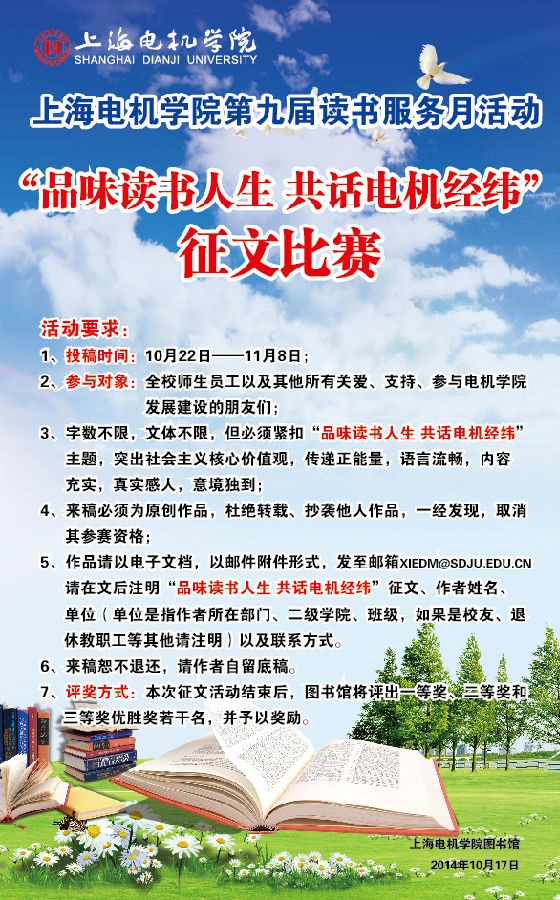 5、作品请以电子文档,以邮件附件形式,发至邮箱xiedm@sdju.edu.cn 请在文后注明“品味读书人生共话电机经纬”征文、作者姓名、单位(单位是指作者所在部门、二级学院、班级,如果是校友、退休教职工等其他请注明)以及联系方式。