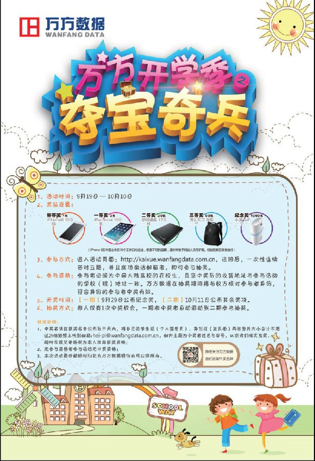 “万方数据夺宝奇兵,土豪大奖等你来拿!”伴随着开学季的脚步,万方数据夺宝奇兵活动于9月19日—10月10日在各大校园火热开展,点击kaixue.wanfangdata.com.cn,登陆夺宝页面,注册答题,则有机会获得IPHONE6、IPAD等大奖,让我们舞动手指,勇夺大奖!(更多详情见海报!)