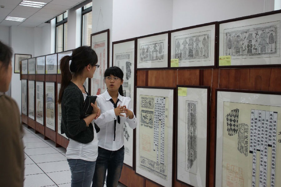 本次80余幅拓片展被分为若干区,有汉代的文字造型展,汉代农民耕种、收获展,汉代贵族狩猎、郊游展及汉代城郭展等,展示了两汉时期大众生活的方方面面。本次拓片展上的拓片是从中原大地收集来的画像砖、画像石上拓印而来,具有珍贵的历史价值,反映了两汉时期中原人的衣食住行,堪称是“两汉时期生活”的珍品。在图书馆展出期间,伴随着古色古香的中国古典式音乐,讲解员绘声绘色地为来访者讲解每一幅作品,诸如人物、山水、灵兽、文字等各种不同形态的拓本,吸引众多师生纷纷前来观摩。本次拓片展受到广大师生的热烈好评,同学们通过参观“历史悠久”的拓片,对两汉时期中原人的生活、生产及交往有了更深层次的了解,引发了他们对两汉历史的追索,特别是通过对拓片上汉文字的了解,对中国汉字的发展、演进有了更深的认识。