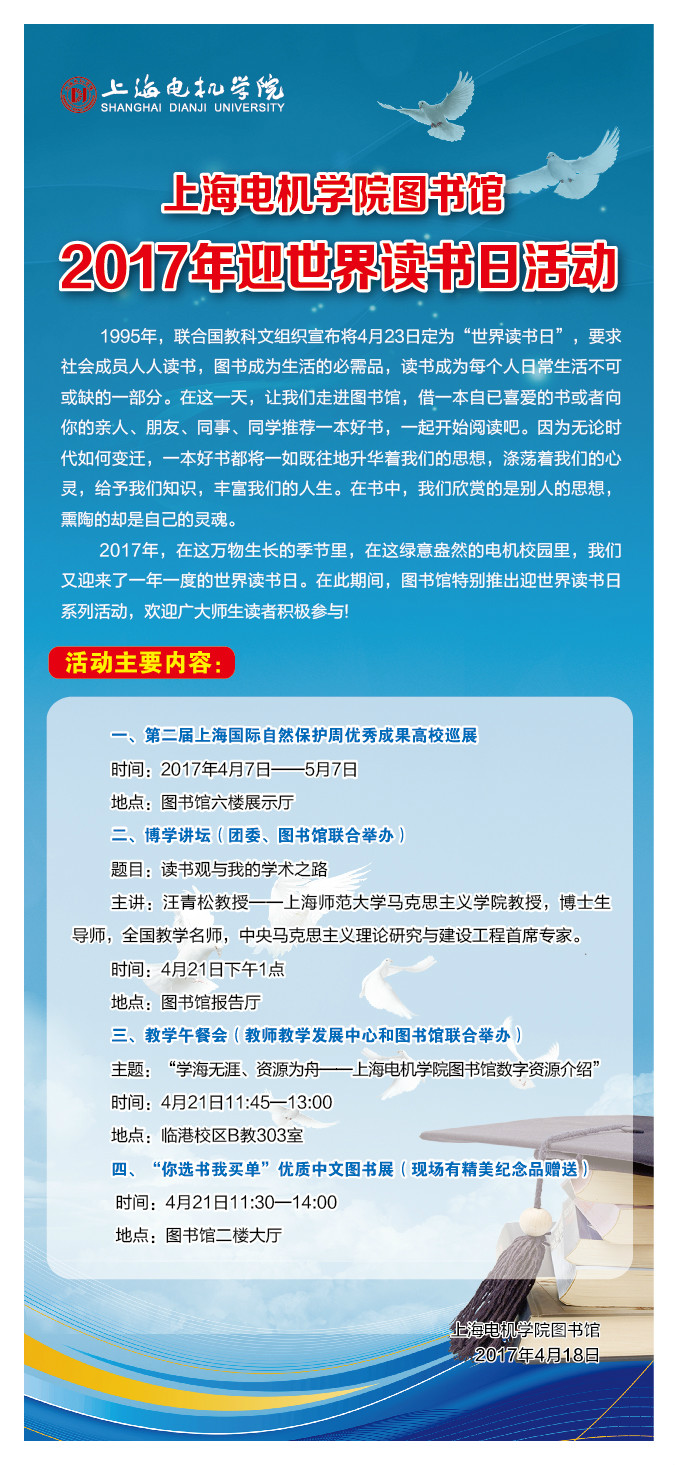 2017年,在这万物生长的季节里,在这绿意盎然的电机校园里,我们又迎来了一年一度的世界读书日。在此期间,图书馆特别推出迎世界读书日系列活动,欢迎广大师生读者积极参与!
