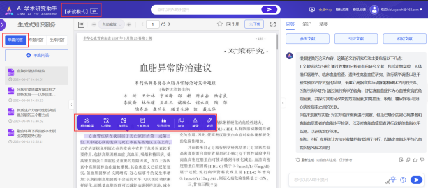①资料研参:AI助手将研究与创作环节有机结合,实现高效创作。当用户在研读文献时,可便捷、系统地记录研读和问答中的文献精要和研究心得,为后期创作准备翔实的学术素材。当用户进入创作阶段,可便捷的将研读资料应用在论文创作中。