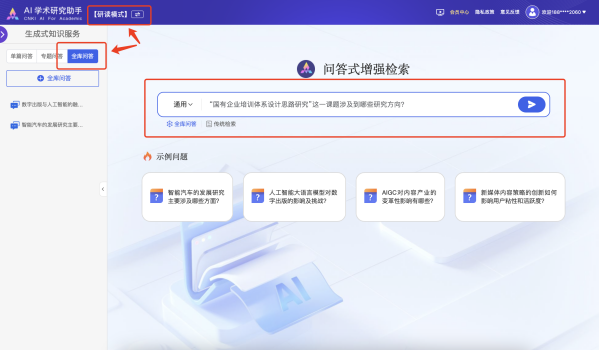 ①学术问答:分为全库问答和新鲜问答两种模式。在全库问答模式下,AI助手将在知网全库范围为用户寻找精准权威的体系化解答。当用户希望在最新的研究成果中生成答案时,可一键切换至新鲜模式。新鲜问答模式基于近十年发表的文献资源,生成最新的回答,让用户轻松把握前沿知识。