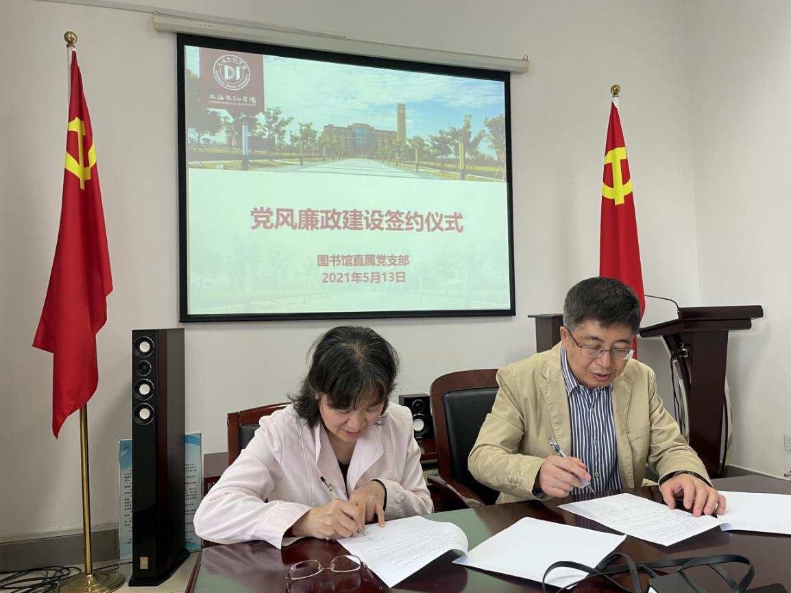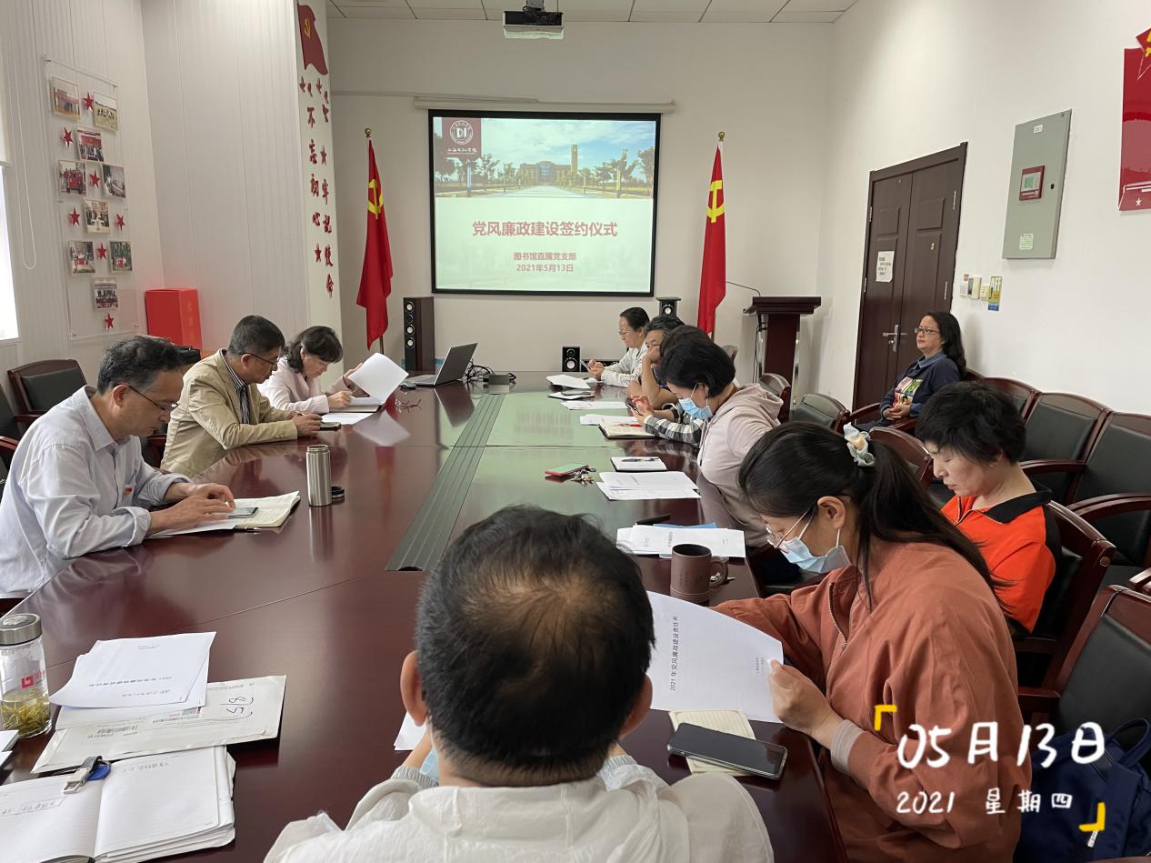 2021年5月14日上午图书馆举行了党风廉政建设责任书签约仪式,全体三级机构负责人以及朱泰英馆长、郑红华副馆长参加,会议由直属党支部书记徐荣华主持。