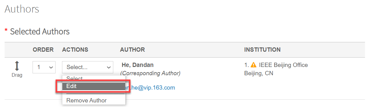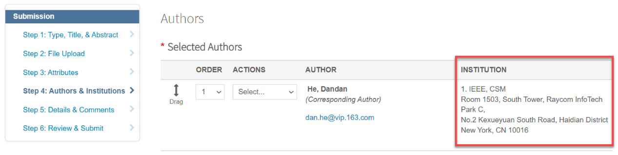 4. 编辑作者所属机构时,系统将向作者提供与作者输入的内容最匹配的机构列表。请作者注意选择学校级别账号,而不是学院或其他附属机构级别账号。仅当作者与所属机构学校级别Ringgold ID成功绑定,方可使用为学校开通的10% APC折扣。