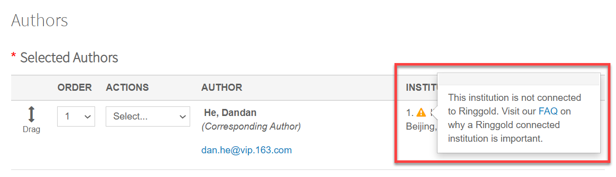 2. 机构信息匹配采用集成在提交稿件的系统中的Ringgold ID。如果作者输入的所属机构无法绑定到特定的Ringgold ID,则会显示一条错误提示。