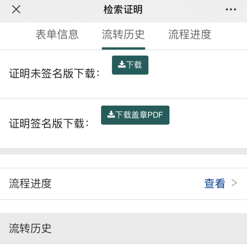 1.扫描文件中左侧二维码可验证检索证明的真实性,可查看文件的表单信息、流转历史、流程进度等信息。