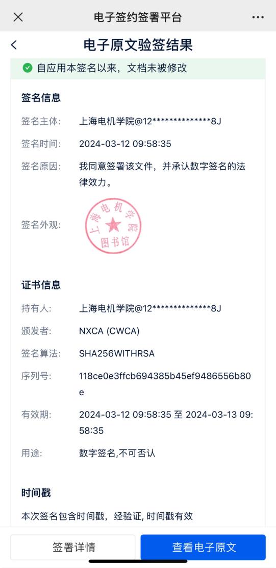 2.扫描文件中右侧二维码可查看电子签章的有效性,点击“查看电子原文”能够查看检索证明的原文。