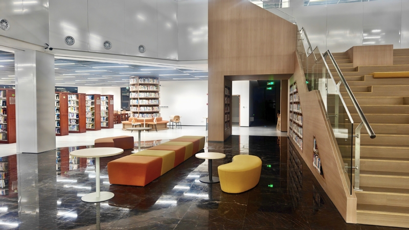 五层“博学·综合”整合跨学科工具书与文献资源,构建从文学艺术到综合类图书的复合阅览环境。阅览区家具设计兼顾实用与舒适,贴合多学科使用特点,进一步提升阅读与学习效率。