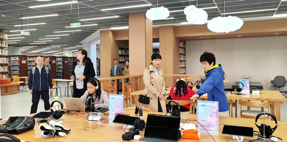 林林一行实地参观了我校图书馆各功能区域,深入了解空间改造与功能提升的情况。张慧文详细介绍了我校图书馆秉持“智慧赋能、空间重塑、功能融合”的理念,系统推进服务体系升级,构建了四大主题楼层,并依托智慧图书馆建设显著提升了服务精准度与管理效能。同时,馆内设置的音乐书吧、静音舱及风格各异的研讨室等特色空间,营造出更多元化的阅览环境,全面提升了师生的使用体验。参观过程中,双方还就关切的问题进行了深入交流。